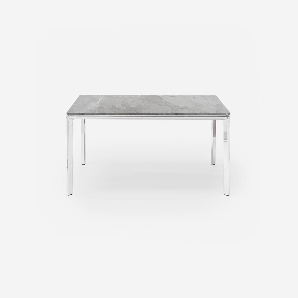 The coffee tables feature a four-legged frame of polished aluminium and a hovering tabletop of marble. Available in two sizes and with two different marble variants, the mix of organic stoneware contrasts the hardiness of the frame.The coffee tables can be displayed in solitary or paired for a complete coffee table composition. Use the smaller coffee table as a side table for either the Vipp610 Loft sofa or the Vipp632 Chimney sofa.
