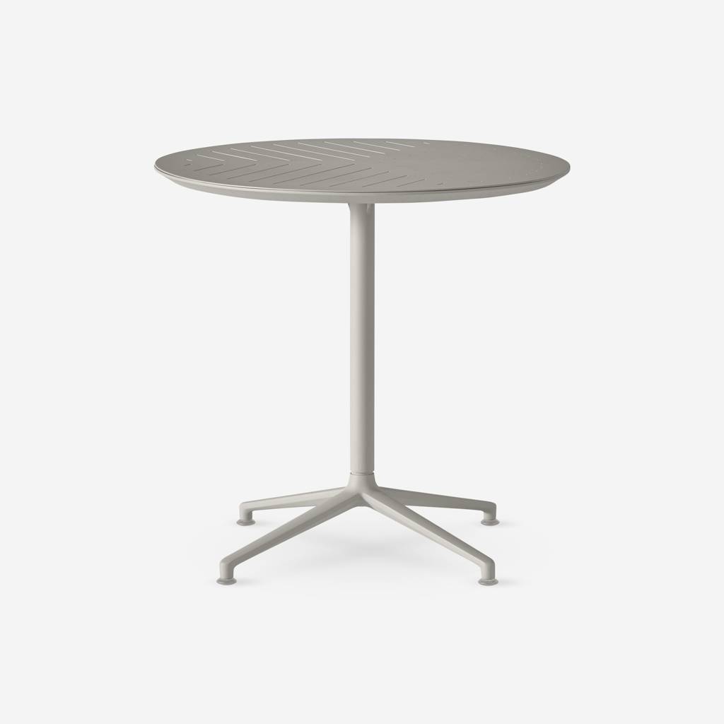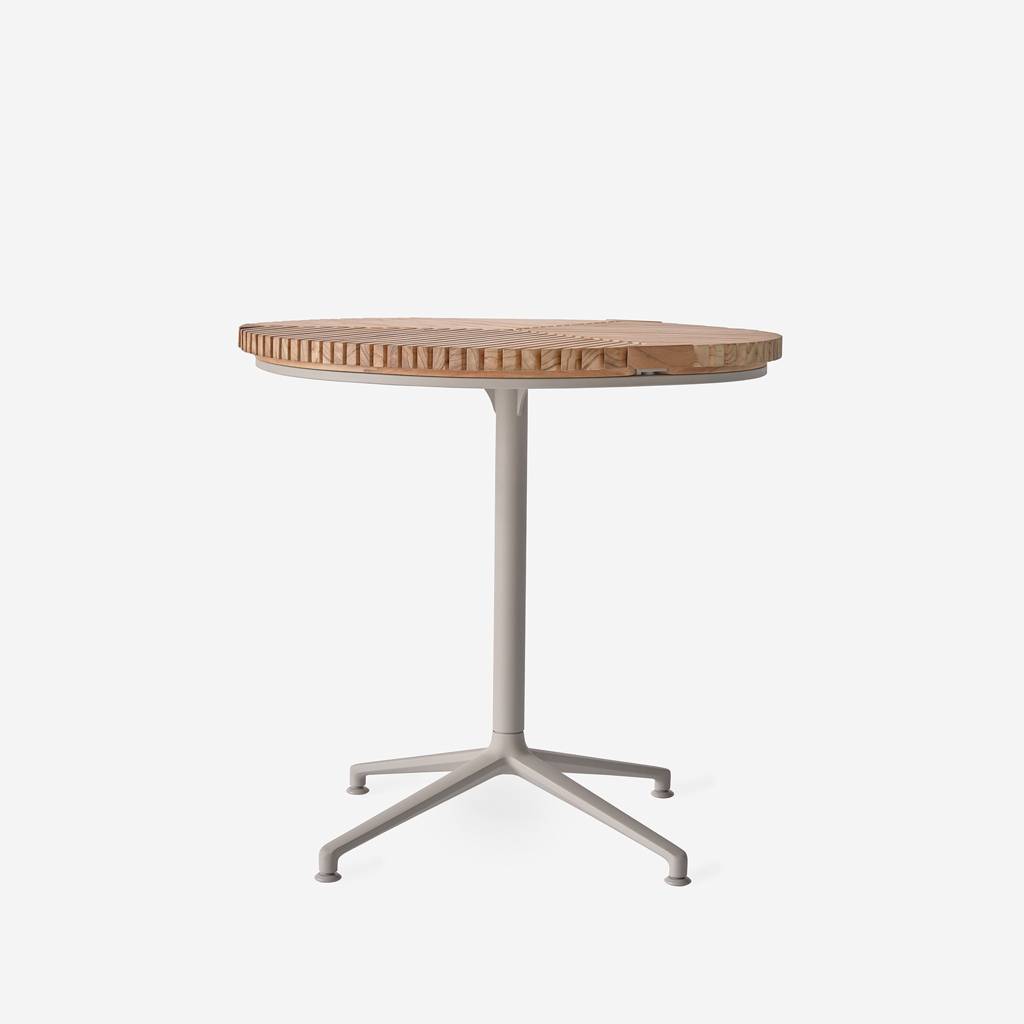 A new café table joins the Open-Air collection. Made entirely from powder-coated aluminium, the Ø75 table is lightweight and easy to move. It complements the existing version with slim teak lamellas, a material repeated across the Open-Air collection. Set on a four-legged base, the materials are selected for durability and resistance to outdoor conditions.